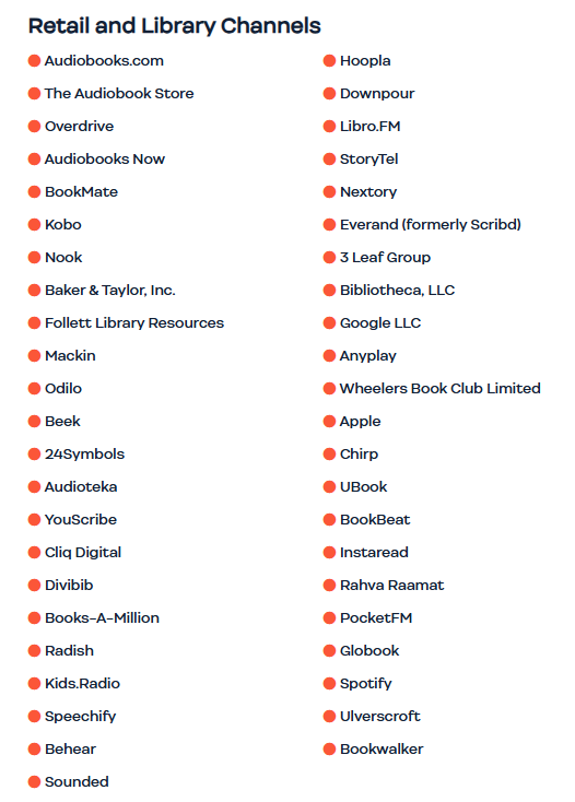 The audio version is currently for sale on iTunes and Amazon. As of 10-9-25, it will also be available (note: some channels can take up to 60 days to list an audiobook) via the following providers below.